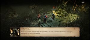 • 베라티엘: 고맙다, 필멸자여. 나는 베라티엘이다. 저주받은 자의 군주와 전쟁을 벌이다 천 년 동안의 고문에서 나를 구해주었구나.