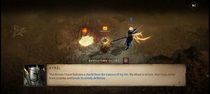 - 카이렐: 내가 사냥하는 악마는 내 동족의 정수로 방패를 만들어 두른다. 내 피는 놈을 유인하는 미끼가 되어, 내가 기습으로 놈의 사악한 방어를 무너뜨릴 수 있게 하지.