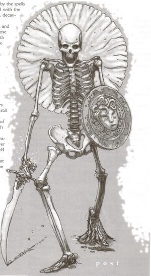 사나운 언데드 전사인 해골은[3] 어두운 전쟁터에서 전사했거나, 가장 신뢰하던 이들에게 배신당해 죽은 자들의 유해입니다.[1] 강령술 의식이나 악마의 주문으로 되살아난[4] 해골들은 산 자의 살을 탐하는 것이 아니라, 오직 희생자의 생명을 앗아가는 것만을 목적으로 합니다.[3] 해골은 장난스럽거나 어리석어 보일 수 있지만[5], 목표를 달성할 때까지 끈질기게 움직이며 좀비보다 빠르고 약간의 지능을 가지고 있습니다.[3] 그 지능의 정도는 해골을 창조하는 데 사용된 주문의 힘과 범위에 따라 달라집니다. 이론상, 동일한 양의 마법 에너지를 사용하여 영리한 해골 하수인 한 명을 만들 수도 있고, 어리석은 해골 백 명을 군대로 만들 수도 있습니다.[5] 육체적으로는 연약하지만, 해골은 그 수가 결코 부족하지 않습니다. 전투 중에 해골에게 쓰러진 자들은 영원히 살아있는 피에 굶주리는 저주를 받게 됩니다. 이러한 생각 없는 분노와 결합하여 해골은 매우 위험한 적이 됩니다.[1] 해골은 사령관이 다른 명령을 내리기 전까지는 무조건적으로 대상을 습격합니다.[6]