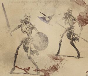 "레오릭 왕 통치 말기, 고대 죽은 자들의 해골조차 안식을 취할 수 없었습니다. 그들은 부서진 갑옷과 무기를 다시 집어 들고, 숨 쉬는 모든 것을 베어 넘길 준비를 마쳤습니다. 비록 쇠약하고 부서지기 쉽지만, 이 피조물들은 교활하고 뒤틀린 지능을 지니고 있어 매우 위협적입니다."