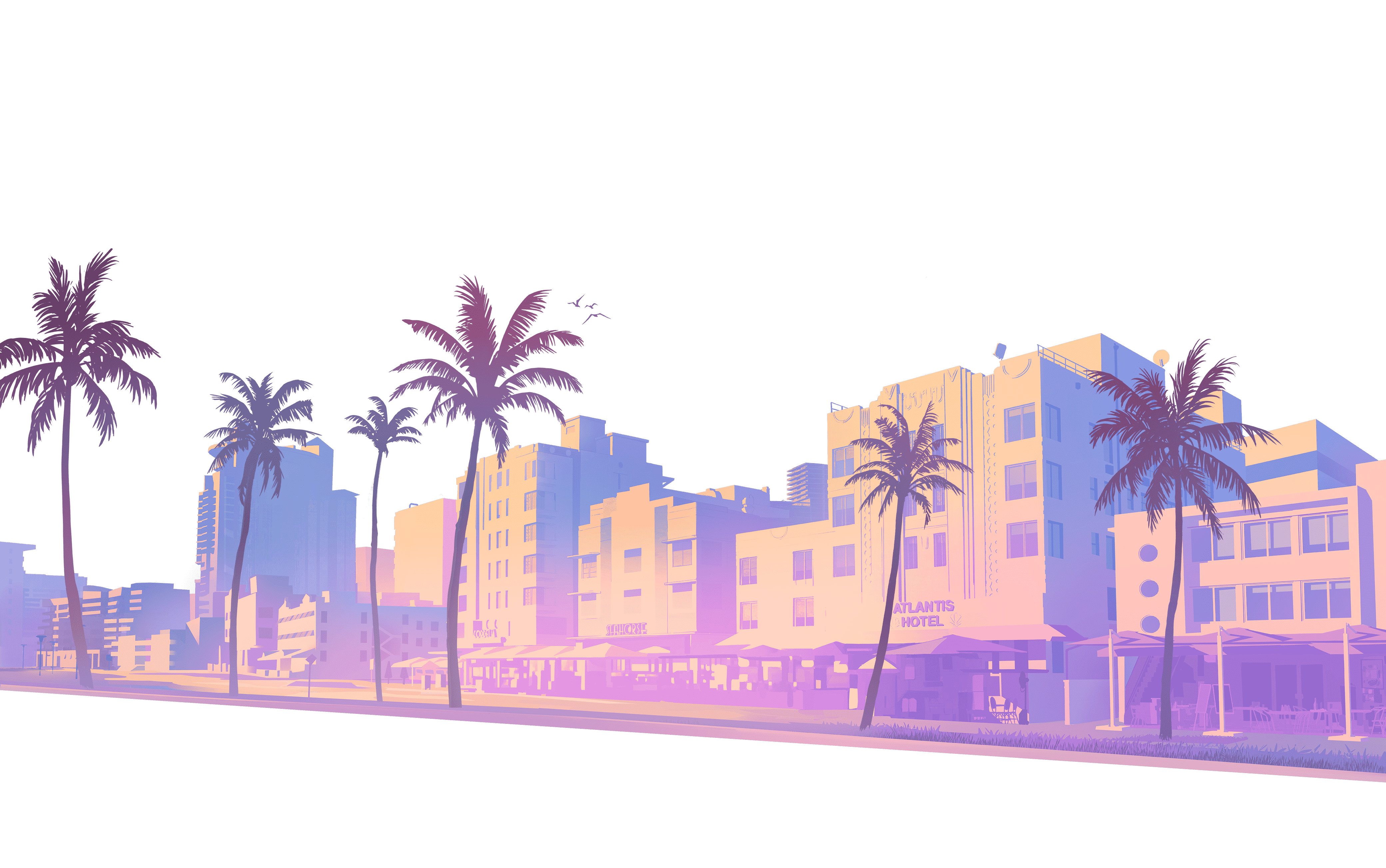 이름 없는 오션 드라이브풍 도로의 독립된 아트워크. 시호스 호텔과 코델리아 호텔 등 숨겨진 호텔 명칭이 확인됨. |