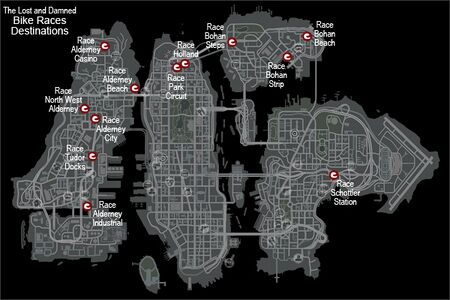 레이스는 리버티 시티 전역에서 진행됩니다. 출발선은 지도상에 빨간색과 흰색 오토바이 헬멧 아이콘으로 표시됩니다.