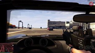 그랜드 테프트 오토 V에서는 운전자나 승객이 이제 차 문 창문 밖으로 손을 내미는 대신 앞유리를 통해 사격할 수 있다 (일부 방탄 유리는 그렇게 할 때 파손될 수 있음에 유의해야 한다). 또한 게임은 운전자로 사격 준비 시 약간 확대된다. 플레이어가 프랭클린 클린턴의 특수 능력을 사용하면, 필요한 정확도를 위해 시간을 늦출 수 있다. 추가적인 현실감을 위해, 승객들은 대부분의 픽업 트럭 적재함에 탑승할 수 있으며, 그레인저 (라이프가드 변형 제외), 경찰 폭동 진압 차량, 루즈벨트 측면에 매달려 그랜드 테프트 오토 온라인에서 무장한 경우 자유롭게 사격할 수 있다. 그랜드 테프트 오토 IV와 달리, 픽업 트럭 적재함, 대부분의 밴 뒷좌석에 탑승하거나 측면에 매달린 승객은 어떤 돌격 소총이든 사용할 수 있다. 또한 오토바이에서 소드오프 산탄총을 사용하는 드라이브 바이 능력도 다시 돌아왔다.