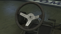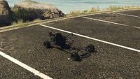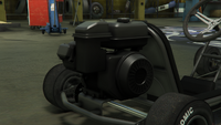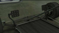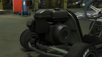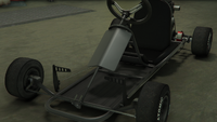 이 차량은 단순한 튜브형 강철 프레임 섀시와 기본적인 바닥으로 묘사되어 있습니다. 전면부에는 앞바퀴, 조향 장치, 그리고 스로틀 및 제동 컨트롤을 제공하는 두 개의 측면 장착 페달이 위치하며, 후면부에는 메인 시트, 작은 배기 장치와 연료 탱크가 있는 소형 엔진, 그리고 엔진과 연결된 왼쪽의 단일 브레이크 디스크 및 체인 구동 장치가 있는 뒷차축이 있습니다. 이 차량은 주요 도로에서 사용하도록 설계되지 않았기 때문에 어떤 형태의 조명이나 계기판도 없지만, 라디오는 여전히 사용할 수 있습니다.