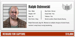 - 첫 번째 대상은 랄프 오스트로스키입니다. 그는 샌디 쇼어 남동쪽에 있는 데이비스 쿼츠에 있습니다. 랄프는 혼자 있지만, 자신의 랜드스토커에 타기 전에 막지 않으면 차량을 타고 도주하려고 할 것입니다. 스턴건으로 쉽게 제압하거나 권총으로 한 발만 쏴도 됩니다. 만약 그가 차량으로 도주를 시도한다면, 타이어 두 개를 쏘면 항복합니다. 트레버가 저격총을 가지고 있다면, 너무 멀리 떨어져 있어 들키지 않은 상태에서 타이어를 쏴서 그가 차에서 내려 도보로 도주하게 만들 수 있습니다. 이후에는 쉽게 제압할 수 있습니다.
