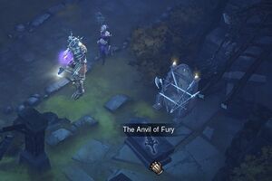 디아블로 III의 그리스월드의 대장간 터에는 무기 거치대가 있는데, 가끔 그곳에 무기가 놓인 돌판 같은 것이 보입니다. 이 돌판 위에 마우스 커서를 올리면 "분노의 모루"라는 이름이 표시됩니다.