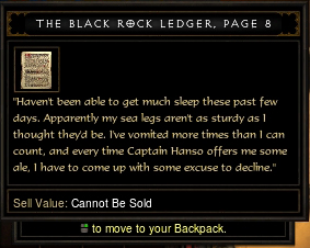 검은 바위 일지(Black Rock Ledger) 페이지는 2막, 피의 도시 퀘스트 진행 중 카심 전초기지 동쪽 문 바로 밖, 고통받는 자들의 벌판 사막에 날카로운 검은 바위 더미에 박혀 있는 오래된 해적선에서 발견할 수 있습니다.