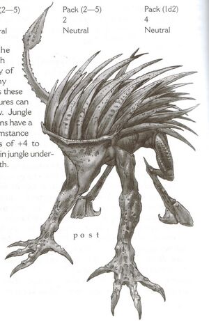 스파이크 핀은 산악 지대에서 발견되는 성가신[1] 사족보행 청소 동물입니다. 갑옷처럼 단단한 등에는 두껍고 단검 같은 가시가 돋아 있습니다. 덩치에 비해 튼튼하며, 등을 구부려 먹이나 자신을 위협하는 포식자를 향해 가시를 발사합니다. 한 번에 하나씩 발사되는 이 가시는 최대 50피트까지 날아갈 수 있습니다. 이들은 후각을 통해 다른 생명체를 감지하고 추적할 수 있습니다.[2] 더 발달된 변종들은 공격 속도가 훨씬 사납고 무리지어 가시를 발사하는 경향이 있습니다. 1264년, 로그 통로로 이동하던 대상들이 이 공격적인 몬스터들의 습격을 여러 차례 보고한 바 있습니다.[1]
