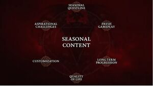 모든 시즌은 성역과 그곳에서의 플레이어의 위치를 더 자세히 보여주는 고유한 퀘스트 라인을 제공합니다. 일부 시즌에서는 새로운 캐릭터가 소개되기도 하고, 기존 캐릭터가 다시 등장하기도 합니다. 시즌 중에는 주말 동안 지속되는 물에 빠진 자의 침공 경고나 메마른 평원의 험준한 바위 사이에 나타나는 낯선 상인의 방문과 같은 라이브 이벤트가 진행됩니다. 이러한 이벤트는 새로운 모험과 고유한 보상을 얻을 수 있는 통로가 됩니다.[1]