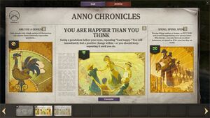 모든 신문 호에는 제국의 중요한 사건과 이정표를 강조하는 세 가지 기사가 포함됩니다. 기사는 새로운 섬 정착, 상위 인구 계층으로의 승급, 다른 플레이어와의 외교 상태 변경, 또는 화재, 폭동, 선박 손실 등과 같은 재난을 포함한 다양한 사건을 다룰 수 있습니다. 제안된 기사는 주민들의 행복도에 전반적인 영향을 미치며, 행복도를 증가시키거나(+5), 감소시키거나(-5), 혹은 아무런 효과를 주지 않을 수 있습니다.