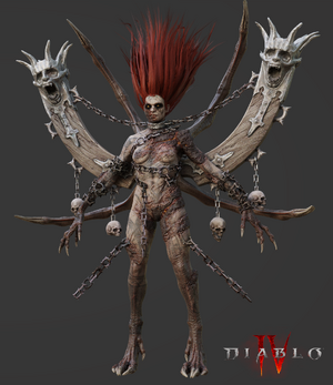 - 디아블로 IV에서는 고뇌의 화신이라는 성격에 맞게 족쇄에 묶여 고통받는 모습으로 디자인이 변경되었다.[16]