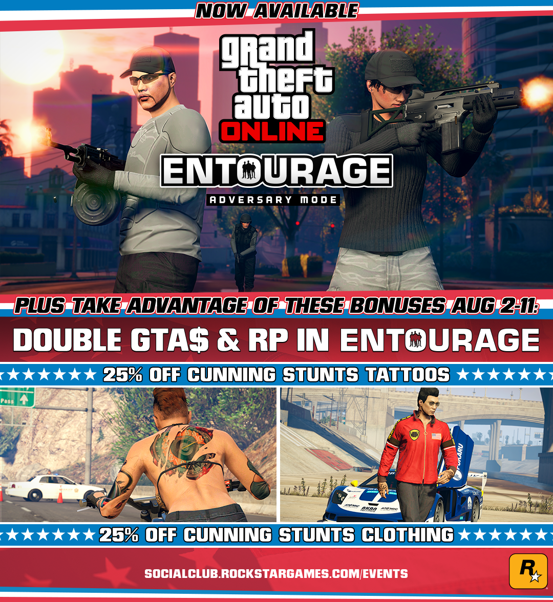 "새로운 문신과 스턴트 의류를 착용하고 새로운 Cunning Stunts 레이스와 유저가 제작한 스턴트 레이스에 도전하세요. 모두 25% 할인된 가격으로 제공됩니다."