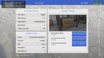 판매를 시작할 때 세션에 있는 경쟁 플레이어(화물을 판매하는 조직과 관련 없는 플레이어) 한 명당 2.5%의 수요 증가 보너스를 얻을 수 있습니다. 최대 수요 증가 보너스는 50%(로비 내 경쟁 플레이어 20명)입니다. 이 수요 증가 보너스는 조직이 특수 아이템을 판매할 때는 적용되지 않습니다.