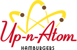 Up-n-Atom은 캘리포니아에서 설립되어 주로 미국 서부에 위치한 햄버거 체인점 In-N-Out Burger를 기반으로 합니다. 이름은 "up and at 'em"(기운 내!)이라는 표현의 언어유희입니다. "한 번 울리면, 왕처럼 먹어라"라는 슬로건은 이미 버거 샷으로 패러디된 버거 킹을 지칭합니다. Up-n-Atom 이름 위의 노란색 곡선은 In-N-Out 로고와 맥도날드의 상징적인 "골든 아치"를 연상시킵니다.