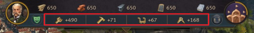 • 생산 건물 - 주민을 위한 상품을 생산하기 위해 노동력이 필요합니다. 노동력이 부족하면 생산 시간이 증가하여 생산율이 감소합니다.