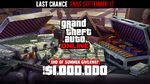 "이번 주는 여름의 끝 GTA$ 경품 행사를 통해 최대 GTA$ 2,000,000을 획득할 수 있는 마지막 기회입니다. 9월 17일까지 GTA 온라인에 접속하여 1회성 GTA$ 1,000,000 보너스를 수령하고, 9월 17일까지 GTA+를 구독하면 추가로 GTA$ 1,000,000을 받아 총 두 배의 보상을 챙길 수 있습니다." — 락스타 뉴스와이어