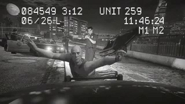 | 첫 출소 후 로스 산토스 남부에서 자신의 오래된 루이너를 타고 추격당하는 모습. | |