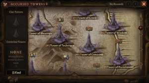 저주받은 탑은 PvE와 PvP 게임 플레이를 모두 포함합니다. 클랜은 탑의 소유권을 차지하기 위해 경쟁하며, 이를 통해 모든 클랜원에게 강력한 보너스를 제공하고 새로운 저주받은 아이템을 획득할 기회를 얻습니다. 이 모드에 참여하려면 플레이어는 반드시 클랜에 소속되어 있어야 합니다.