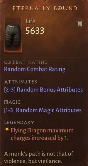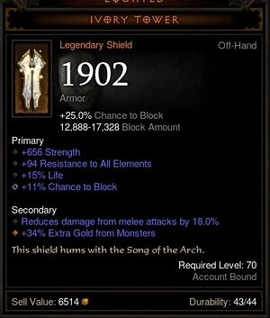 틀:희귀과 달리, 틀:Legendary은 해당 유형의 아이템에는 일반적으로 허용되지 않는 속성을 가질 수 있습니다(예: 가슴 방어구의 틀:마법). 많은 아이템이 해당 아이템 전용의 재련 가능하거나 재련 불가능한 고유 속성을 지니고 있습니다(예: 틀:3는 근처의 악마 및 언데드 적에게 피해를 주고 주기적으로 밀쳐냅니다). 전설 아이템의 일반 속성은 훨씬 높은 수치로 부여되며(다른 전설 아이템과 비교해도 극도로 높을 때가 있습니다), 비슷한 레벨의 일반 아이템보다 더 많은 수치를 제공합니다. 하지만 여전히 어떤 전설 아이템들은 특별한 능력치나 속성이 없는, 그저 이름만 거창한 "틀:희귀"인 경우도 있습니다. 시간이 흐름에 따라 이러한 전설 아이템들은 새로운 이름, 설명, 속성을 부여받아 교체되며, 이전 버전은 '유산(Legacy)' 아이템이 됩니다.