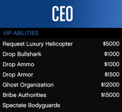 플레이어는 VIP/CEO로서 수많은 능력을 사용할 수 있습니다. 여기에서 할 수 있는 것들: