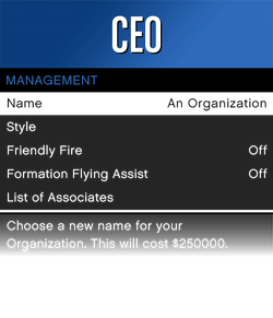 새로 등록되는 조직의 이름은 생성 시 기본적으로 '조직(An Organization)'으로 설정됩니다. VIP 상태는 일시적이므로 CEO만이 영구적인 조직 이름을 유지할 수 있습니다. 조직 이름은 등록 후에도 GTA$50,000를 지불하고 변경할 수 있습니다.