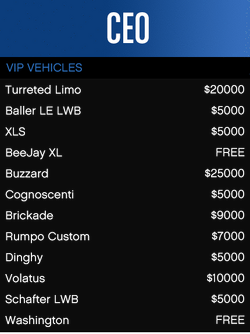 플레이어는 다양한 고유 차량을 요청할 수 있으며, 대부분 방탄 처리되어 있습니다. 모든 차량은 무광 검정색 마감으로 생성되며, 플레이어가 적절한 구역에 있는 한 개인 차량이나 헬리콥터가 보통 도달하지 못하는 지역(예: 해변이나 비포장 도로) 근처에 생성됩니다. 같은 차량을 요청하면 이전 차량이 위치만 변경될 뿐 손상된 상태는 수리되지 않으며, 파괴 시 다시 요청하기까지 2분의 재사용 대기시간이 발생합니다. VIP/CEO 차량을 운전하는 도중 조직에서 탈퇴하면 플레이어는 차량에서 강제로 쫓겨납니다.