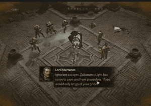- 마르타노스 경: 무지한 야만인들. 자카룸의 빛이 너희를 너희 자신으로부터 구원하러 왔다. 자존심만 버렸더라면. 내 앞에 총대주교를 데려와라. 그러면 끝날 것이다. 라키스의 통치에 복종해라. 그렇지 않으면 이 산을 피로 물들일 것이고, 그는 피비린내 나는 진흙탕을 통치하게 될 것이다.