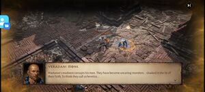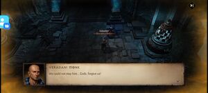 - 베라다니 수도사: 아직... 마르타노스를 보지 못했네... 검은 안개가 분출할 때 총대주교님은 수도원에서 명상 중이셨어. 우리가 그분께 가려 했지만, 나아갈 길이 없었지... 우리가 실패했어. 어둠을 봉인하기엔 우리 수가 너무 적어. 어둠이 너무 강해. 그분이... 우리를... 모두 죽일 거야.