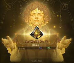 독실한 사제이자 맹렬한 전사였던 그녀는 메피스토를 봉인하기 위한 전투에 참여했다. 일반 병사들은 증오의 군주가 쏟아내는 언데드 무리를 상대하기에 벅찼지만, 카탄은 높은 천상의 힘을 불러와 화염의 정수와 결합함으로써, 마법을 배우지 않은 이들도 사용할 수 있는 빠르고 강력한 신성한 화살을 만들어냈다. 이것이 신성한 화살 주문의 기원이다.[2]