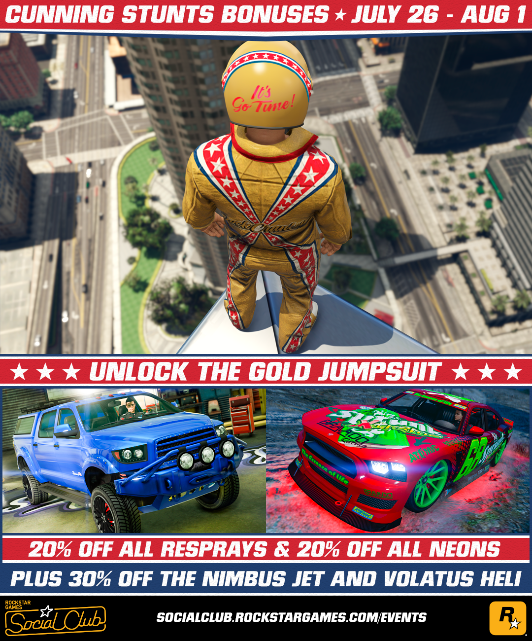 - ↑ 7월 27일 수요일부터 7월 29일 금요일까지, 모든 스턴트 시리즈 레이스에서 GTA$와 RP를 두 배로 지급합니다. 지도에 표시된 분홍색 스턴트 시리즈 아이콘을 통해 입장하거나, GTAV 로딩 화면에서 바로 스턴트 시리즈로 뛰어들 수 있습니다.