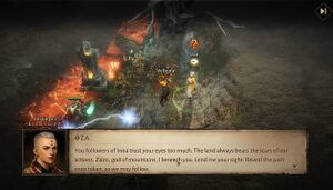 • 수도사: 이나를 따르는 자들은 눈에 보이는 것만 너무 믿는군요. 대지는 우리가 행한 일의 흉터를 항상 기억합니다. 산의 신 자임이여, 당신의 시야를 빌려주소서. 과거의 길을 드러내어 우리가 따라갈 수 있게 하소서.