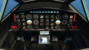 항공기 내부는 매버릭 및 버자드 어택 헬기와 같은 기본 항공기의 "플라이어" 다이얼 세트가 있는 넓은 계기판을 특징으로 합니다. 왼쪽 절반의 배열은 아토믹 블림프 및 제로 블림프의 왼쪽 절반과 유사하지만, 오른쪽 스위치는 생략되고 대신 동일한 배열이 다른 절반에도 복사되어 있습니다. 또한 파란색 마커가 위에 추가되고 왼쪽에 해당 녹색 "기어 업/다운" 디스플레이가 표시됩니다.