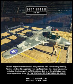 버킹엄의 파이로는 Grand Theft Auto Online에 스매글러의 밀수 업데이트의 일환으로 파이로 위크 이벤트 기간 중 2017년 10월 10일에 출시된 군용 트윈 붐 전투기입니다.