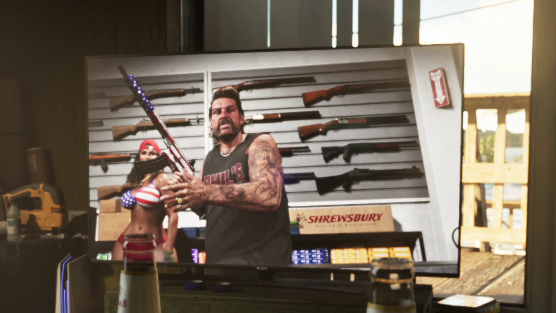 "오늘 당장 필의 아뮤네이션으로 오세요! 법이 허용하는 것보다 더 많은 총을 보유하고 있습니다! 우후!"